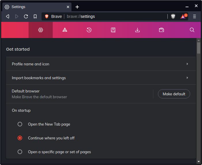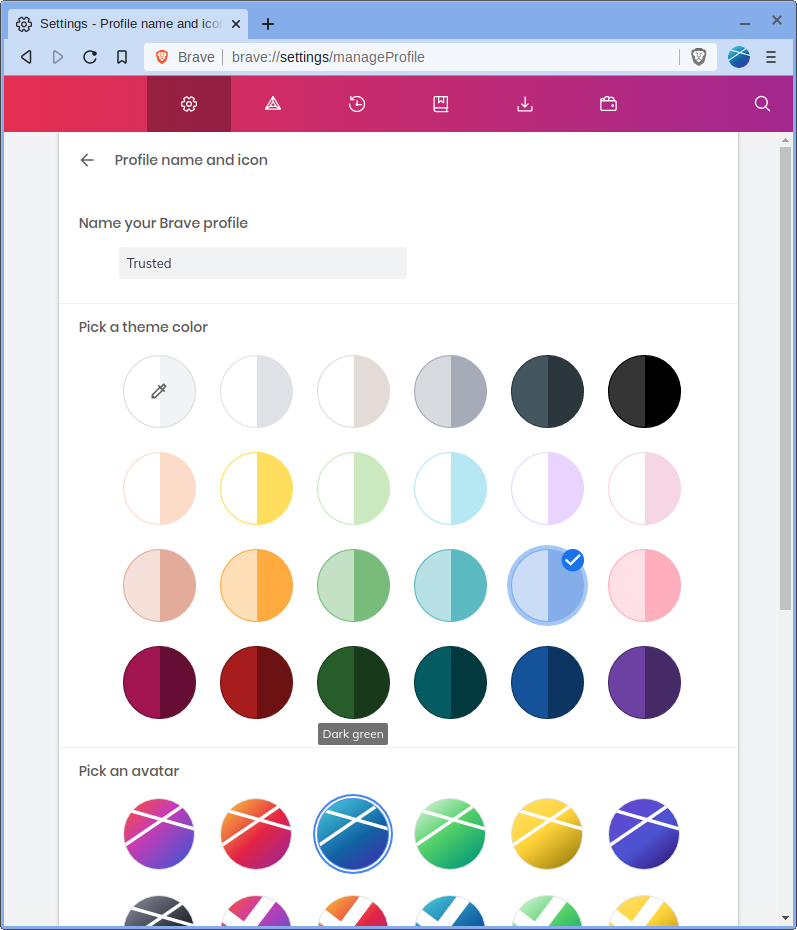 Under ‘Get Started’, we can set the profile’s colors and icon. This is useful for distinguishing different profiles from each other, otherwise every Brave Browser window will look the same.