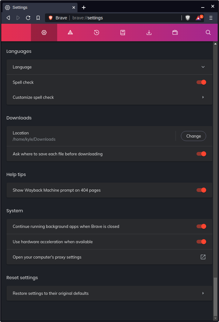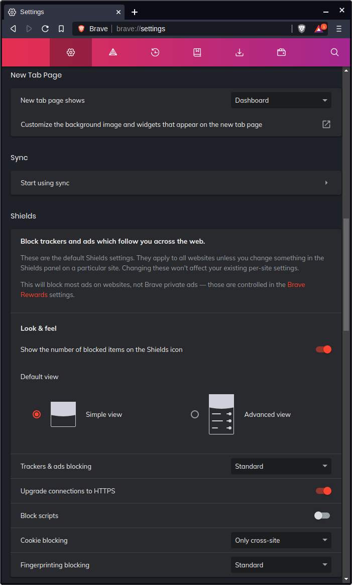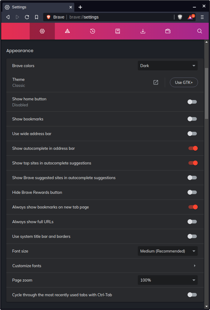 Other settings you may wish to set: ‘Use wide address bar’, ‘hide Brave rewards button’, and ‘Always show full URLs’.