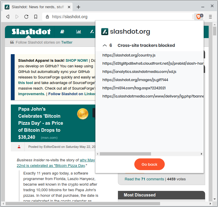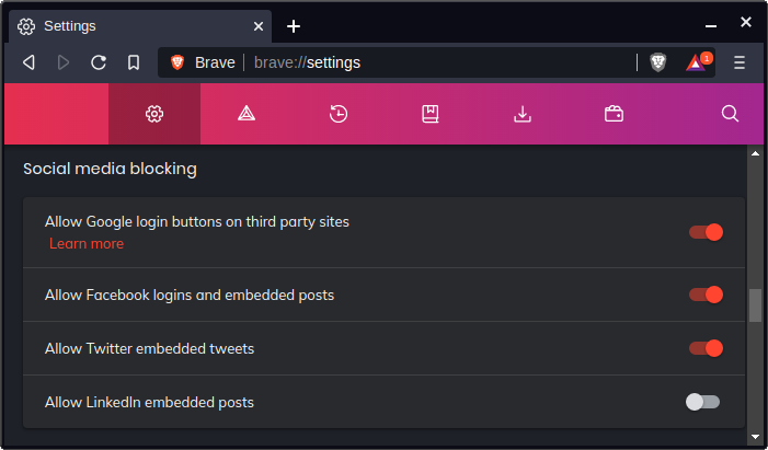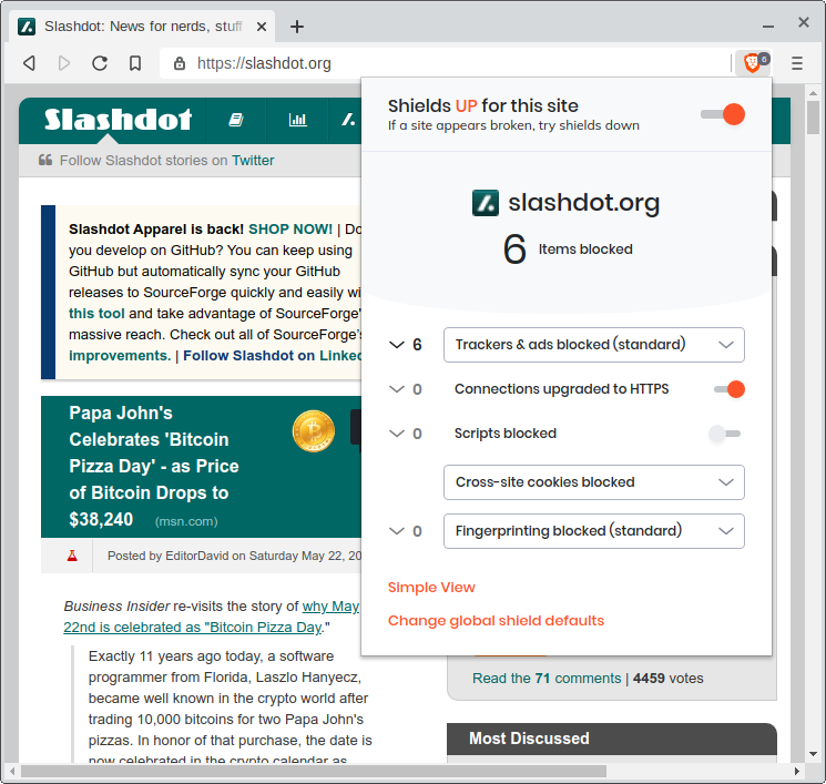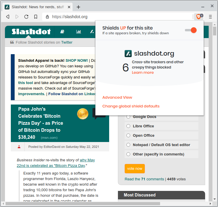 Here we have a switch to toggle Shields for the current site, as well as a report of how many “creepy things” were blocked.