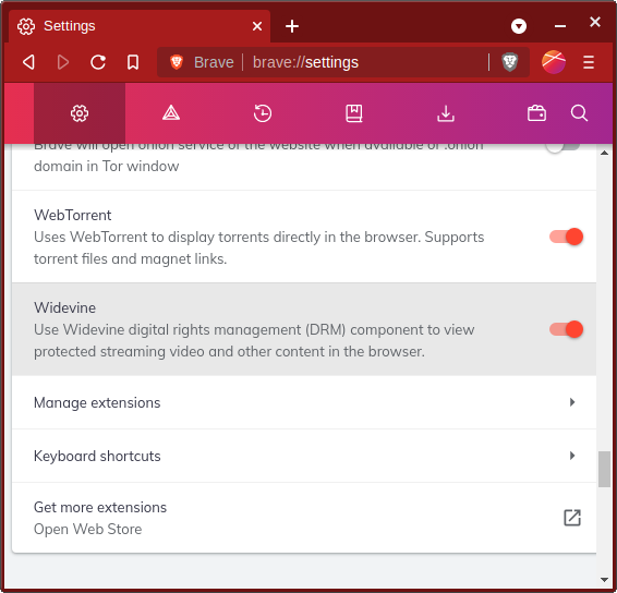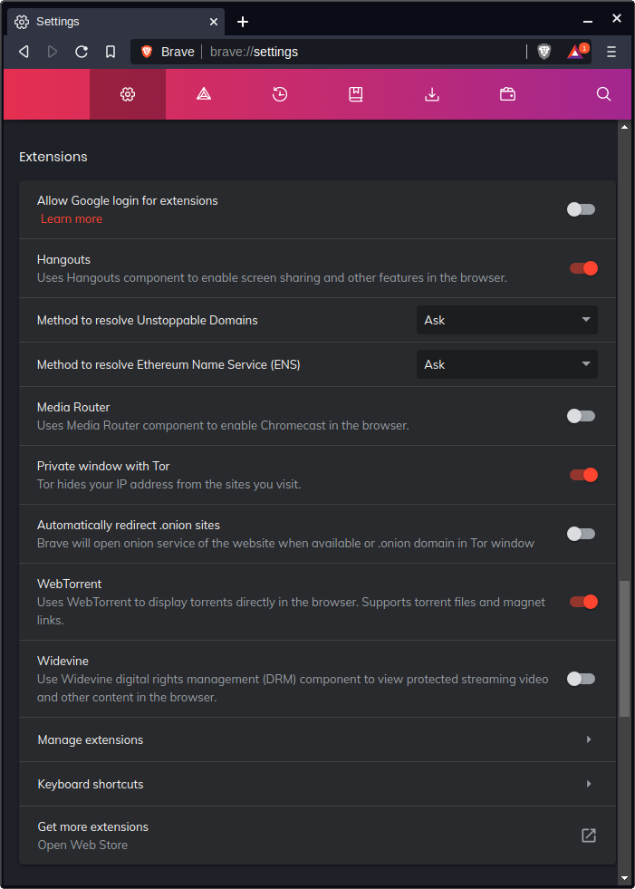 There are several extensions that come bundled with Brave. The Tor Private Window is an interesting feature that you may or may not desire. Tor Private Window is a Private Window, except with everything routed through TOR. TOR is a multi-layer proxy that political dissidents in despotic nations use to hide their footprints6. It is rather useful as a quick anonymizer, and I have used it on several occasions as such. Be warned however: TOR is also the same multi-layer proxy that criminals and no-lives use, so it might draw the attention of the nearest network admin.