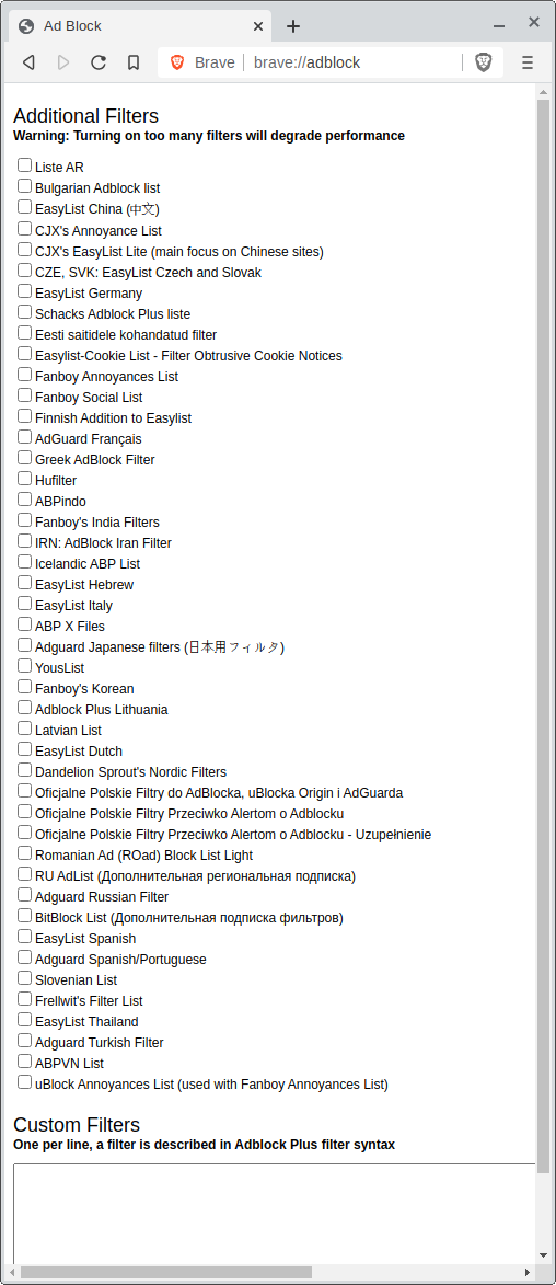We can add additional filters (even custom ones) to Brave. Go to the