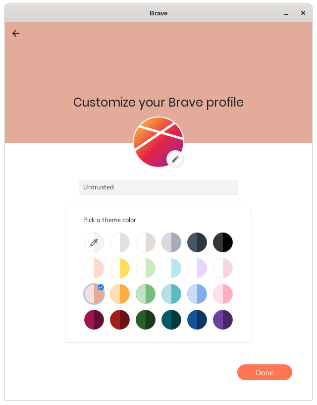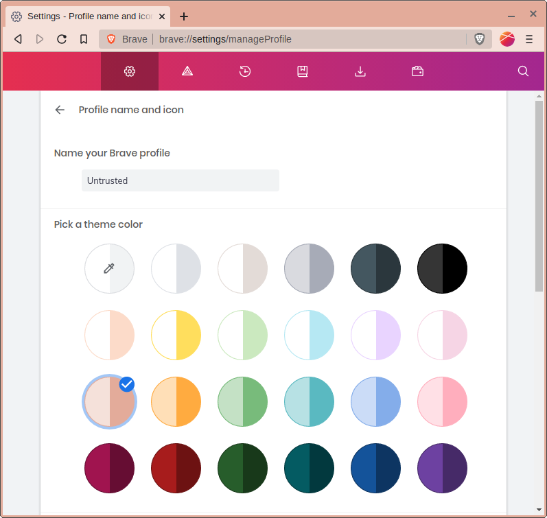 I generally like to set colors for profiles to make them easy to distinguish from each other. Usually red means untrusted (throwaway data), yellow means semi-untrusted (don’t throw away data), green means semi-trusted (slightly cleaner), and blue means trusted (cleanest of all for sensitive data). This is just a suggestion. You can use whatever colors you like. In this demo, let’s create an untrusted profile and use the shade of red which Brave calls ‘Beige’.