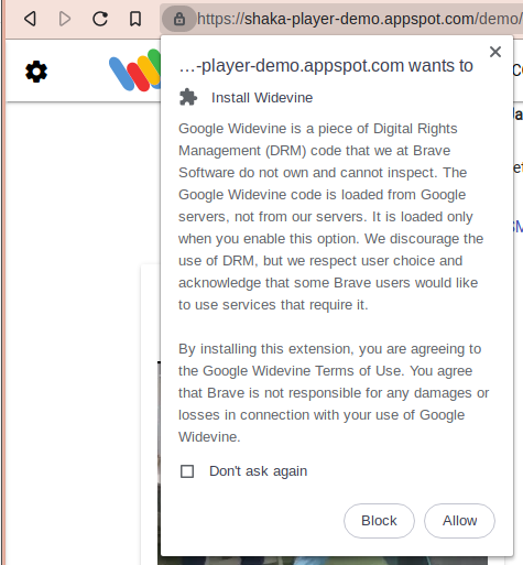 If you have not seen this message, then point Brave to https://shaka-player-demo.appspot.com/ and try to play the “Sintel” short film, which is protected by Widevine DRM. (In my testing, I needed to select the compiled version of the player.)