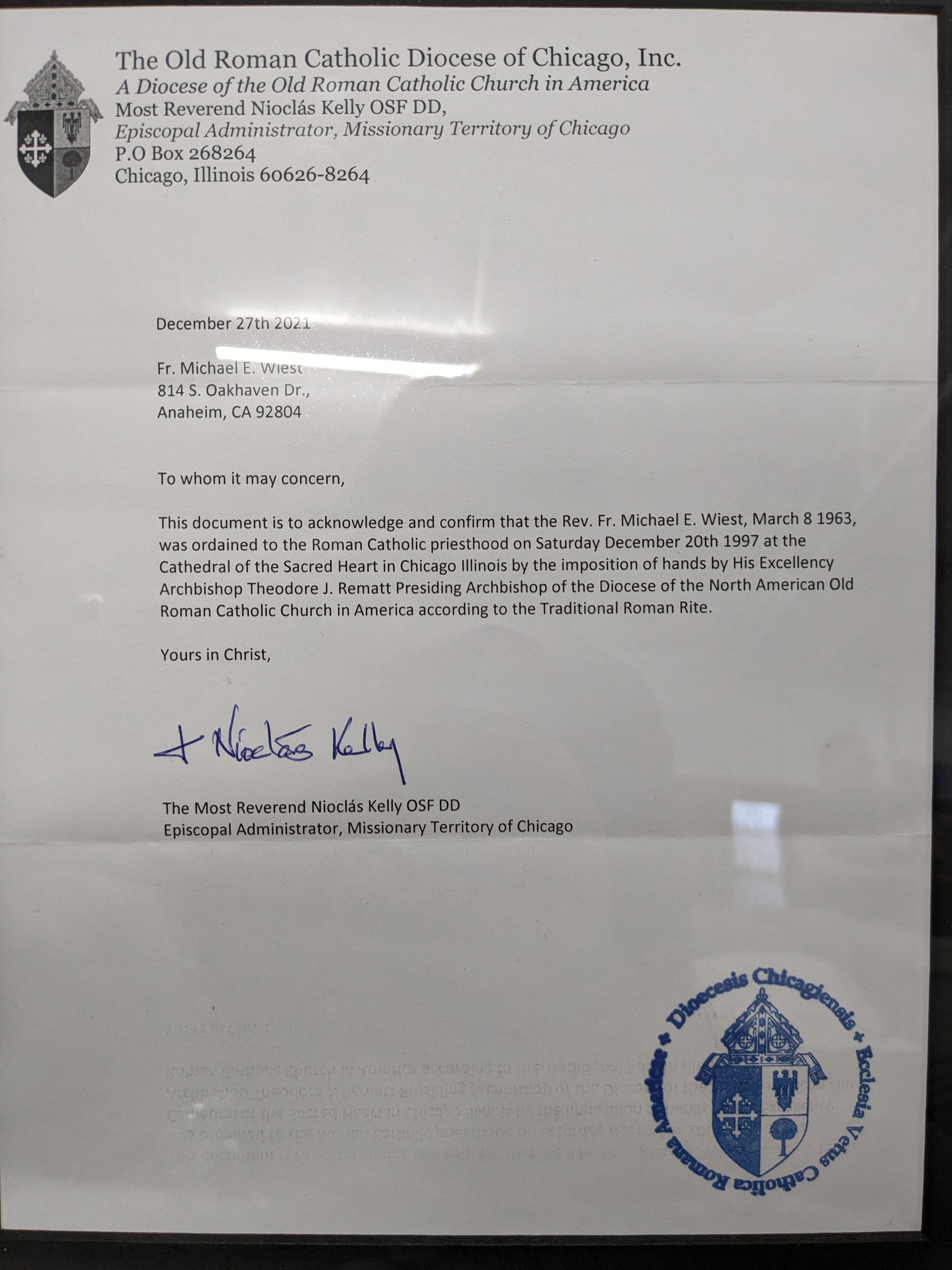 This document is to acknowledge and confirm that the Rev. Fr. Michael E. Wiest, March 8 1963, was ordained to the Roman Catholic priesthood on Saturday December 20th 1997 at the Cathedral of the Sacred Heart in Chicago Illinois by the imposition of hands by His Excellency Archbishop Theodore J. Rematt Presiding Archbishop of the Diocese of the North American Old Roman Catholic Church in America according to the Traditional Roman Rite.